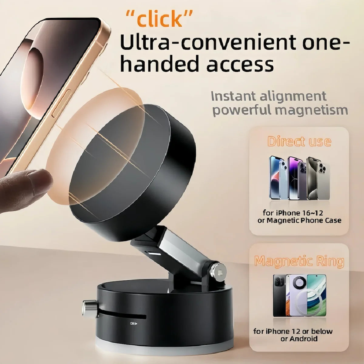 Tecnologia de vácuo magnético reutilizável para fixação ultra-forte no painel. Compatibilidade universal com iPhone 12-17 Pro Max, Samsung Galaxy S25/S24/S23, Google Pixel e Huawei.